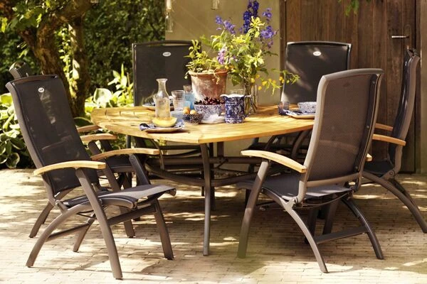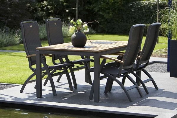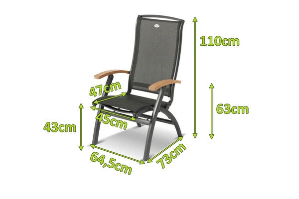 Mit ihm kommt die perfekte Kombination aus Stil und Komfort in den heimischen Garten – denn das Modell besticht nicht nur durch den robusten Aluminiumrahmen und die hochwertigen Armlehnen aus FSC®-Teakholz, sondern auch durch die justierbare Rückenlehne, die aufrecht wie zurückgelehnt herausragenden Komfort bietet. Der gesamte Sessel ist in einem edlen anthrazit gehalten, lediglich die Armlehnen aus FSC®-zertifiziertem Teak sind farblich hervorgehoben.