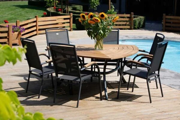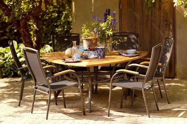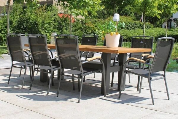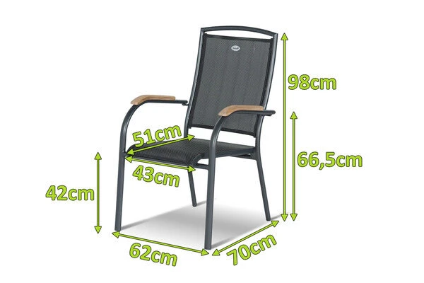 Die schlichte Optik mit dem pulverbeschichteten Aluminiumrahmen in der Farbe Xerix, dem gleichfarbigen Textilen-Gewebe (70% Polyvinylchlorid, 30% Polyester) und den Armlehnen aus edlem FSC®-Teakholz macht dieses Modell dabei zu einem echten Hingucker. Dank des Aluminiumgestells ist der Stuhl zudem leicht und einfach zu transportieren.