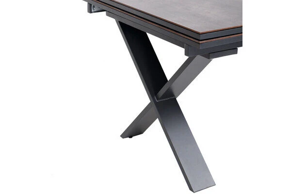 Innovative Materialien verleihen dem Tisch seinen besonderen Look. Die graufarbene Tischplattenoberfläche aus HPL harmoniert perfekt mit dem modernen X-Gestell aus Aluminium in der Trendfarbe “OUTFLEXX® anthrazit matt”. Die ca. 6 mm dicke Tischplatte wird aus HPL (High-Pressure Laminat) gefertigt und überzeugt durch eine einmalige Optik. Das Material besteht aus vielen Schichten Harz und Papier, die unter hohem Druck zusammengepresst werden, so dass eine robuste glatte Oberfläche entsteht. Die Tischbeine haben längs einen Abstand von ca. 135 cm und die Höhe bis zur Tischunterkante beträgt ca. 64,5 cm. Mit einem Gewicht von ca. 49,4 kg ist der Tisch auch äußerst stabil.