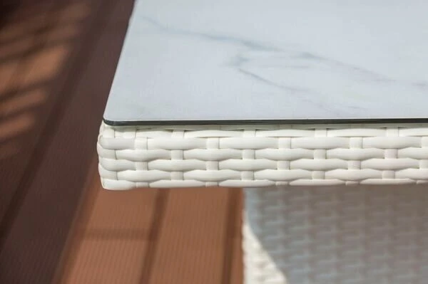 Das Untergestell des Möbelstücks besteht aus pulverbeschichtetem Aluminium, dies macht es nicht nur stabil, sondern sorgt auch dafür, dass es sich aufgrund des relativ geringen Gewichts von ca. 42,8 kg leicht hin und her stellen lässt. Das Aluminiumgestell wird mit Polyrattangeflecht bespannt. Das flache Geflecht ist in der Farbe weiß (Faser w29) gehalten und passt so wunderbar zu allen möglichen Terrasseneinrichtungen.