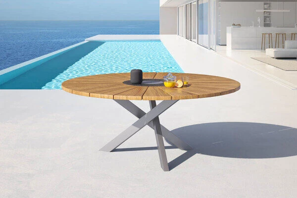 Das dreibeinige, gekreuzte Gestell ist gefertigt aus rostfreiem, gebürstetem 304er Edelstahl, welcher optisch ergänzt wird durch eine hochwertige, FSC®-zertifizierte Teakholzplatte mit ca. 23 mm breiten Bohlen. Mit seinen Maßen von ca. Ø 170 x 76 cm und seinem Gewicht von ca. 64,5 kg bietet der Tisch ausreichend Platz für bis zu 6 Personen. Zum Schutz Ihrer Terrasse sind die Tischbeine zusätzlich mit Kunststofffüßen bestückt.
