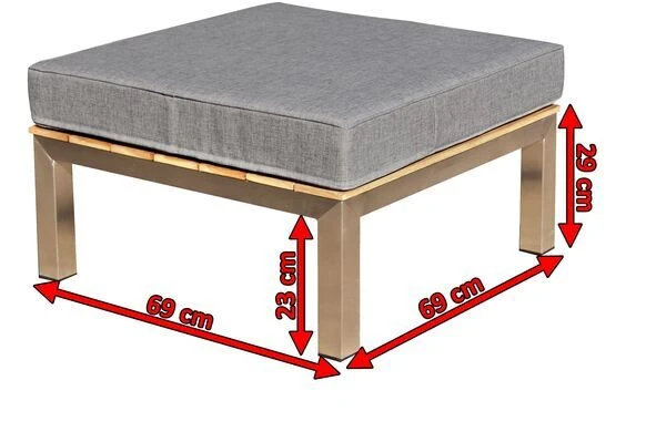 OUTFLEXX® Hocker aus gebürstetem Edelstahl und FSC-zertifiziertem Teakholz mit grauem Polster aus Olefin
