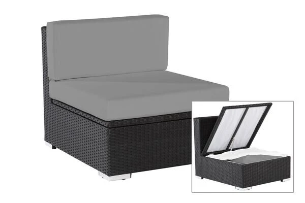 Ob als Bestandteil einer Gartenlounge oder als Balkonmöbel: Dieses Modulelement bietet Ihnen die beste Grundlage für Ihre individuelle Gartengestaltung. Das Mittelelement ist absolut wetterfest und äußerst pflegeleicht. Extreme Temperaturen zwischen -60°C und +70°C können der Polyrattanfaser nichts anhaben. Das einsitzige Mittelelement verfügt über edle Aluminiumfüße, die dank der Kunststoffnoppen Ihren Bodenbelag schonen und einen schönen Kontrast zur flachen Polyrattanfaser bilden. Dieses Mittelelement bietet Ihnen mit seiner bequemen Polsterung besten Komfort, um stundenlang relaxen zu können. Es ist mit bis zu ca. 150 kg belastbar. Die Sitzfläche lässt sich hochklappen. Der Stauraum darunter ist mit einer wasserdichten Kissentasche ausgestattet, die mittels Reißverschluss geschlossen wird. Alle Polster lassen sich so sicher und problemlos verstauen. Einzelne Modulelemente bieten zudem den praktischen Vorteil, Ihre Gartenlounge bei Bedarf zu erweitern und immer wieder neu anzuordnen.