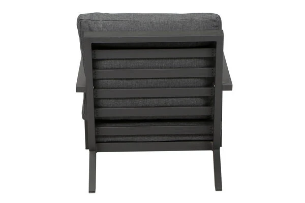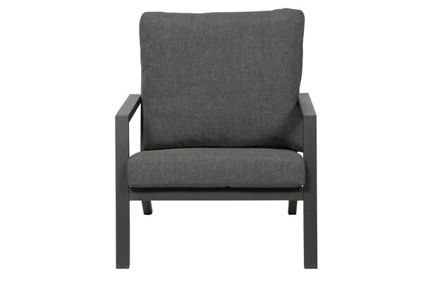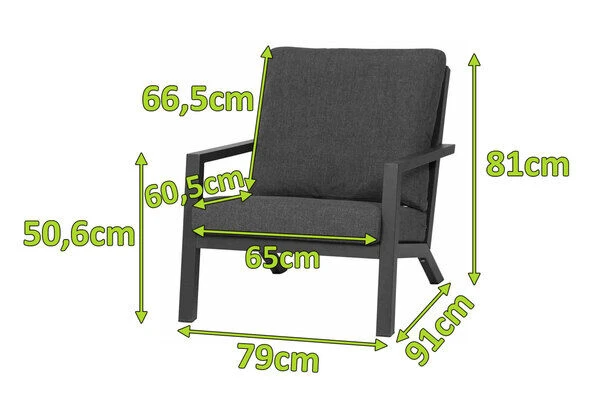 Modern und chic – dieser wetterfeste und pflegeleichte Loungesessel bietet höchsten Sitzkomfort gepaart mit modernem Design. Gönnen Sie sich ein wenig Luxus in Ihrem Alltag und verbringen Sie in gepflegter Atmosphäre den Tag auf Ihrer Terrasse: bei einem leckeren Frühstück, bei einer gemütlichen Mittagspause oder lassen Sie einfach den Tag entspannt ausklingen. Der bequeme Sessel macht es möglich und lädt Sie und Ihre Gäste jederzeit unaufdringlich zum Verweilen ein. Die praktischen ca. 50,6 cm hohen Armlehnen aus Aluminium bieten zusätzlichen Komfort. Der Sessel hat ein Gesamtmaß von ca. 79 x 91 x 81 cm, die Sitzfläche ist ca. 65 cm breit, ca. 60,5 cm tief und die Sitzhöhe liegt bei ca. 30 cm, die perfekte Loungehöhe.