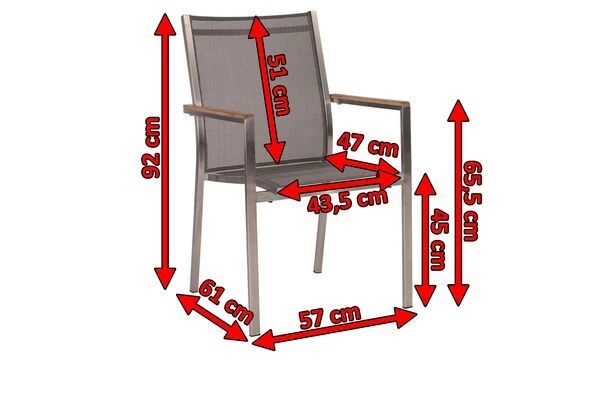 Der Cardiff überzeugt nicht nur mit seinem zeitlosen Design und den hochwertigen Materialien, sondern vor allem auch durch seinen Komfort und seine Funktionalität. Schlicht, unauffällig und dennoch ein Hingucker. So lässt sich der Cardiff wohl am besten beschreiben. Holen Sie sich mit diesem Stapelsessel Eleganz vereint mit perfektem Sitzkomfort nach Hause und genießen Sie entspannte Stunden z.B. nach Ihrem Feierabend. Die hochwertigen Materialien und die sorgfältige Verarbeitung sorgen nicht nur für die besondere Optik dieses Stuhls, sondern machen ihn mit einer Belastbarkeit von ca. 120 kg zusdem sehr stabil. Der Cardiff wird Ihnen durch seine hohe Widerstandsfähigkeit gegen Wind und Wetter viele Jahre Freude bereiten. Das verwendete Edelstahl der Güteklasse 304 ist rostfrei und ebenso wie das Textilgewebe der Sitzfläche und Rückenlehne besonders pflegeleicht. Leichte Verschmutzungen lassen sich ganz einfach mit ein wenig Wasser wieder entfernen. Das für die Armlehnen verwendete Teakholz ist FSC-zertifiziert und stammt damit aus verantwortungsvollen Quellen. So können Sie sich guten Gewissens zurücklehnen und sich so richtig entspannen. Durch seine Stapelfunktion und den Maßen von ca. 61 x 57 x 92 cm lässt sich der Stuhl aber dennoch platzsparend verstauen, wenn Sie doch einmal etwas mehr Platz auf Ihrer Terasse oder im Garten benötigen sollten.