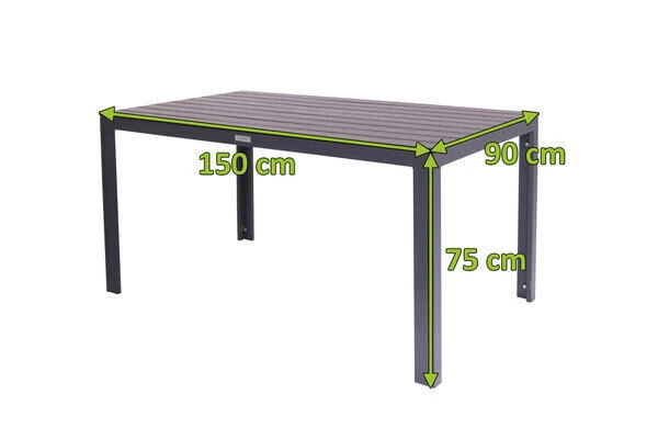 Ganz gleich, was Sie vorhaben – ob ein gemeinsames Kaffeekränzchen, ein Brunch, ein Abendessen oder auch ein gemütlicher Spieleabend – der elegante, rechteckige Tisch bietet Ihnen immer das passende Ambiente. Mit seiner Größe von ca. 150 x 90 x 75 cm haben Sie ausreichend Platz für bis zu 6 Personen. Das Tischgestell aus pulverbeschichtetem Aluminium gibt dem Tisch eine besonders hohe Stabilität und dank seines Gewichtes von ca. 18,7 kg ist der Tisch auch bis ca. 50 kg belastbar. Die Tischbeine haben längs einen Abstand von ca. 143 cm und die Höhe bis zur Tischunterkante beträgt ca. 68 cm. Für die ca. 2 cm starke Tischplatte wird ein modernes Kunststoff-Holzimitat verwendet. Das Zusammenspiel aus der Oberfläche in Holzoptik und dem edlen Untergestell aus stabilem Aluminium verleiht dem Tisch sein besonderes Aussehen. An dieser Tafel sitzen Sie nicht nur bequem, sondern mit Stil. Hier wird jedes gemütliche Beisammensein zu etwas Besonderem. Überzeugen Sie sich von der Leichtigkeit der verwendeten Materialien und dem modernen Design des Tisches. Mit den hochwertigen Materialien ist dieser Tisch nicht nur pflegeleicht, sondern auch witterungsbeständig: Trotzen Sie Sonne, Wind und Wasser! Das Gestell aus Aluminium in der Trendfarbe silber ist aufgrund der Pulverbeschichtung widerstandsfähig gegen jegliche Umwelteinflüsse.